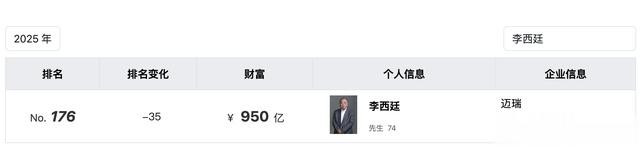胡润2025年全球富豪榜显示,迈瑞医疗创始人李西廷以950亿元身家,位列全球第135位,排名较去年下滑35位。值得注意的是,2021年李西廷曾以210亿美元身家问鼎新加坡首富宝座。