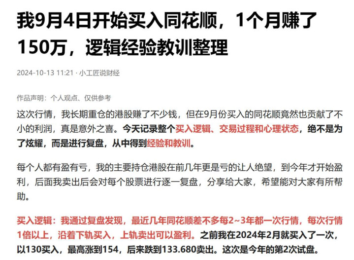 关于同花顺这个股票,我在2024年10月13日的文章《我9月4日开始买入同花顺,1个月赚了150万,逻辑经验教训整理》里面无偿分享了我的购买操作、策略及逻辑。